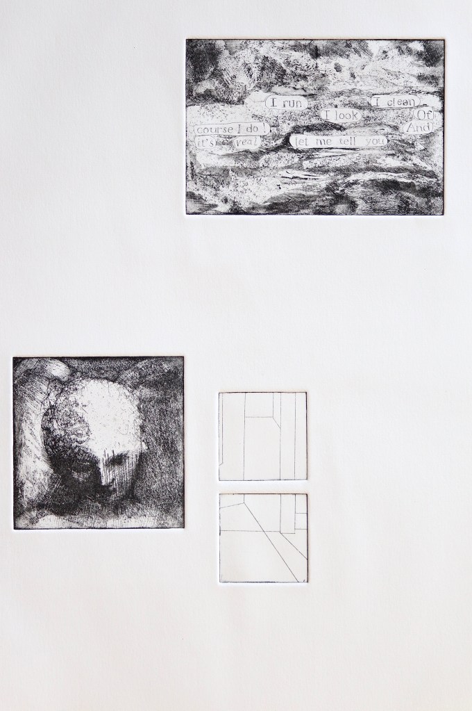 This print is a response to the COVID19 crisis and somewhat of a departure from my usual work. Throughout the COVID pandemic the phrase “in these unprecedented times’ was frequently used, especially by politicians and senior scientists during the daily briefings. This work reflects the anguish, loneliness and loss that many have felt during this time. Yet it aims to also offer a calmness and solace through the collective experiences of people across the world. The mundane chores of life and work continue whilst the haunting presence of the virus stands by, waiting. The two smaller plates show an open door symbolising hope and comfort.