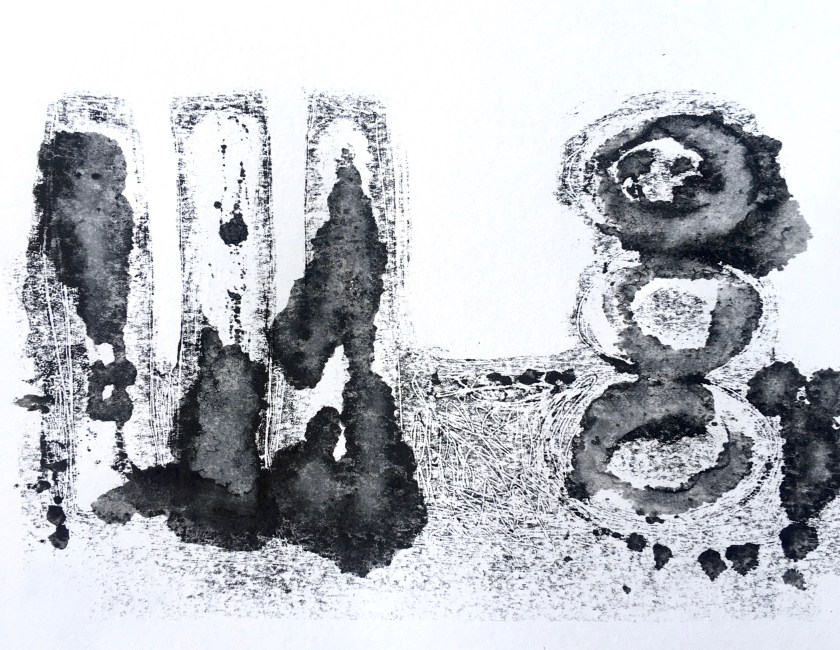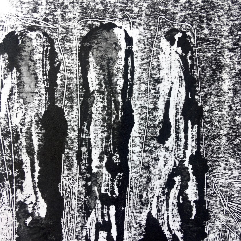 I find that monotype printmaking is a great way to explore a theme swiftly. The mark making process is expressive and immediate, and the accidental marks produced add to the spontaneity of the method. The three column motif is one that has been running for a while and has crossed over into landscape study when visiting large cities. It did not however arrive from skyscraper, more the theme of ‘three strikes and you’re out’.