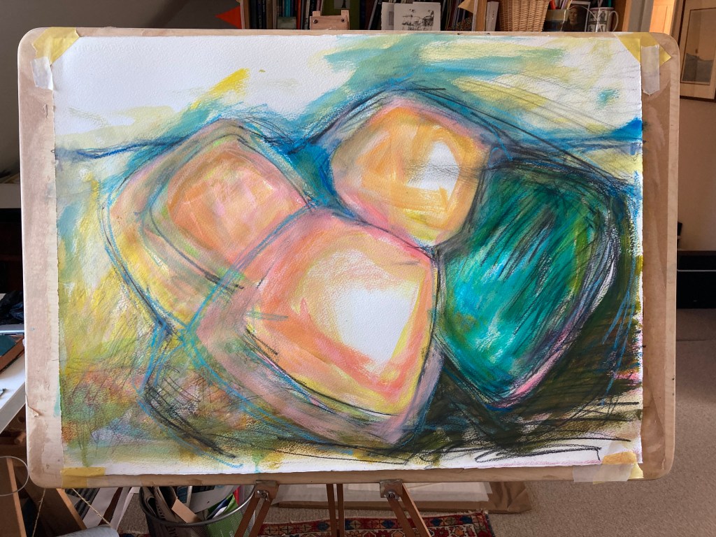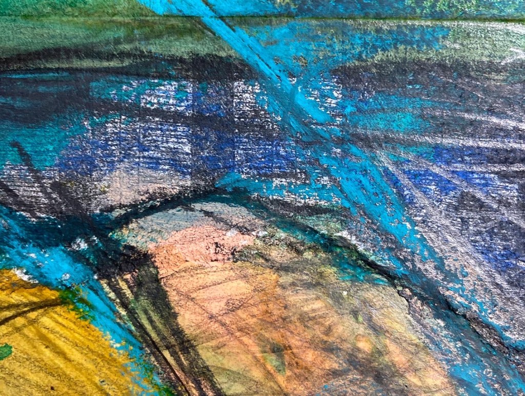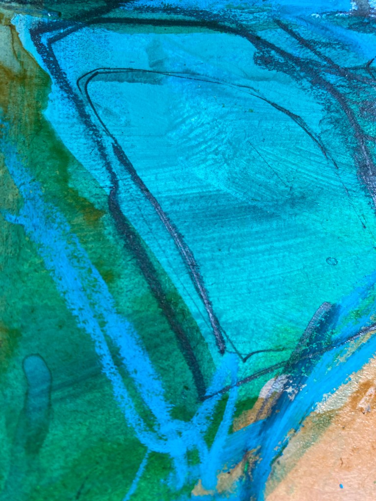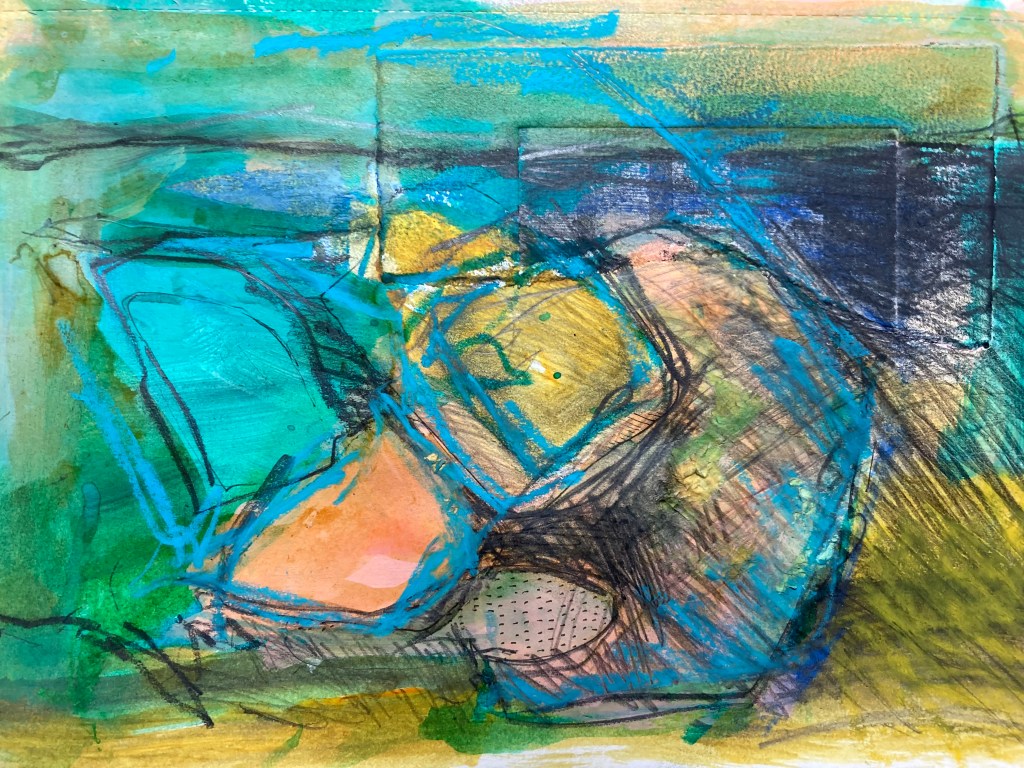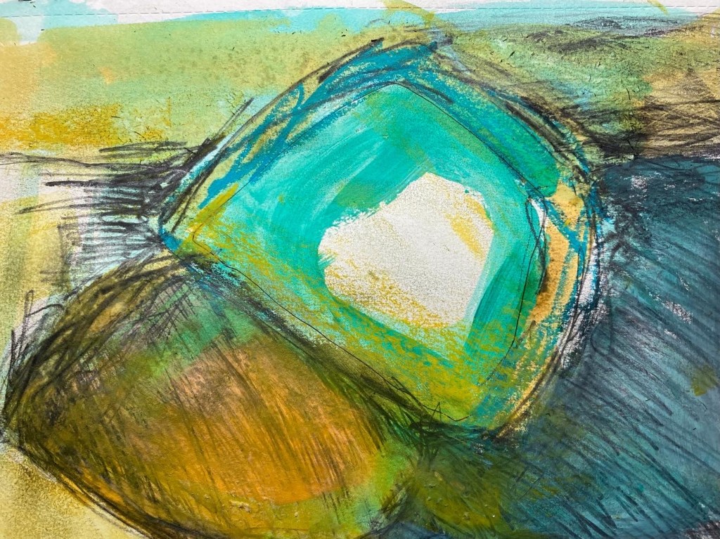 The sketchbook has been full of colour and energy this month. The shapes and flow are taken from the summer en plain air sketches of the SW coast. Using oil pastels, acrylics, collage and graphite sticks, the work has been swift and emotional.The blues and greens perhaps are drawn from the clear waters of summer swimming, but wherever they have arrived from, they are a welcome distraction from the autumnal windy weather outside.